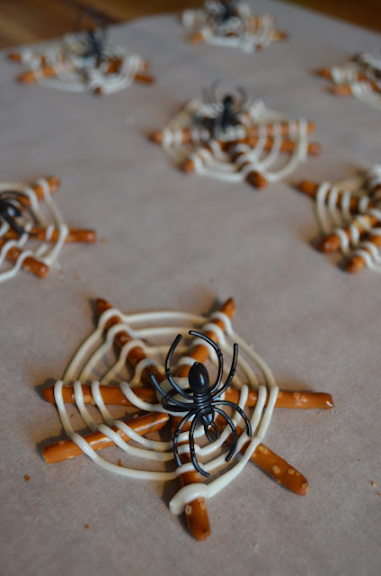 I saw these really cute spider web snacks {from Sara at Mom Endeavors} around Halloween last year when they were making the rounds on Pinterest. I thought they were absolutely adorable, but with all the stuff that we had going on for Halloween {last year and this year} I never got around to making them. So when I got a note saying Henry's class was having a County Fair to celebrate reading the book Charlotte's Web, I knew this would be the perfect snack to make! They fit in perfectly with their celebration, and they were a big hit with the teachers and the kids!